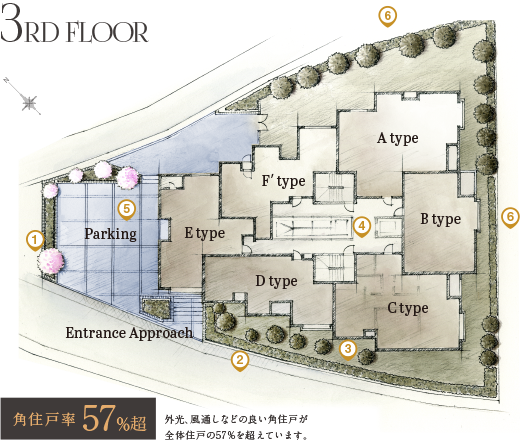 敷地配置および3階イメージ図/景観の敷地配置図は、計画段階の図面を書き起こしたもので実際とは異なります。
